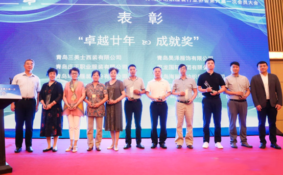 青岛市纺织服装行业协会应时代发展成立,20多年来在服务政府、行业、企业方面尽自身最大努力履行了相关的职责。作为感知行业发展最近的组织,20年道路崎岖,充满挑战,20年兢兢业业,不负韶华。20年间,如终有一批会员企业陪伴协会共同成长。为向他们坚守执着的工作精神致敬,表彰其在行业发展中做出的贡献,大会决定对青岛三美士西装有限公司、青岛庄正职业服装有限公司、青岛鑫联服饰有限公司、青岛红雨伞时装有限公司、青岛昊泽服饰有限公司、巴龙国际集团、青岛海丽花边织带有限公司、青岛即发集团股份有限公司、青岛雪达集团有限公司10家企业进行表彰。